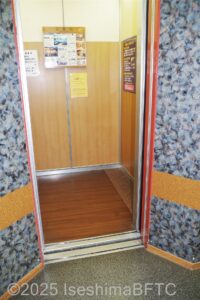 手すりなし・後方確認用鏡なし・車いす用操作盤なし・開延長ボタンなし・点字表記なし・浮き出し文字なし・音声案内なし・かご内現在階表示なし