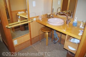 洗面台下高さ69センチ。車いすのままでもひざがつかえない高さ。