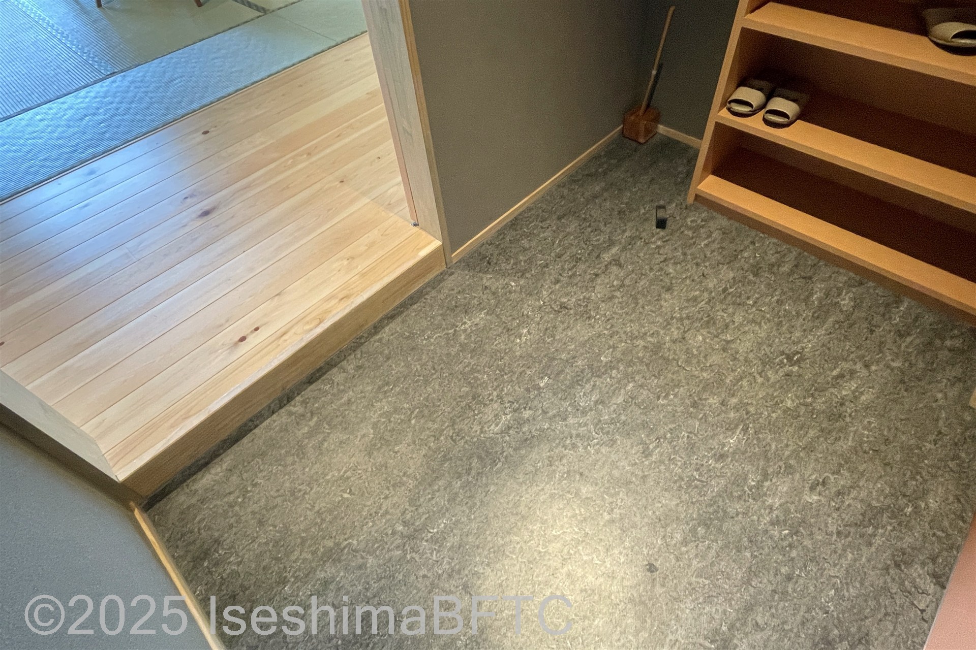 洗面脱衣室へのスロープ長さ75センチ、傾斜約10度。視覚障害の方にもわかりやすいように、スロープの始まる部分の床の色を変えてある。