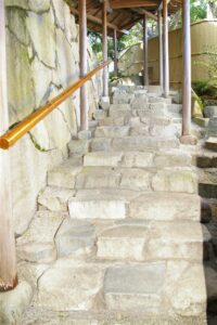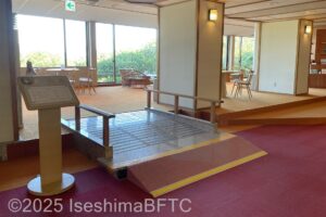 入口からフロント・ロビーへの、4段の階段とスロープ。スロープは、やや傾斜がきつい(傾斜約8度、1/7.5)ので注意。