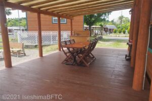 広いリゾートデッキ(ウッドデッキ)とガーデンテーブル。テーブル下高さ70センチ。