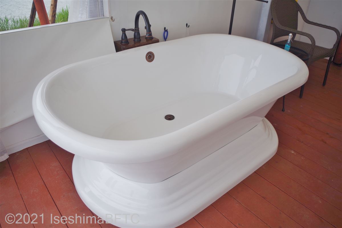 アウトドアリビングに置かれたリゾートバス。二人でも余裕の大きさ。床から浴槽縁までの高さは61センチ。