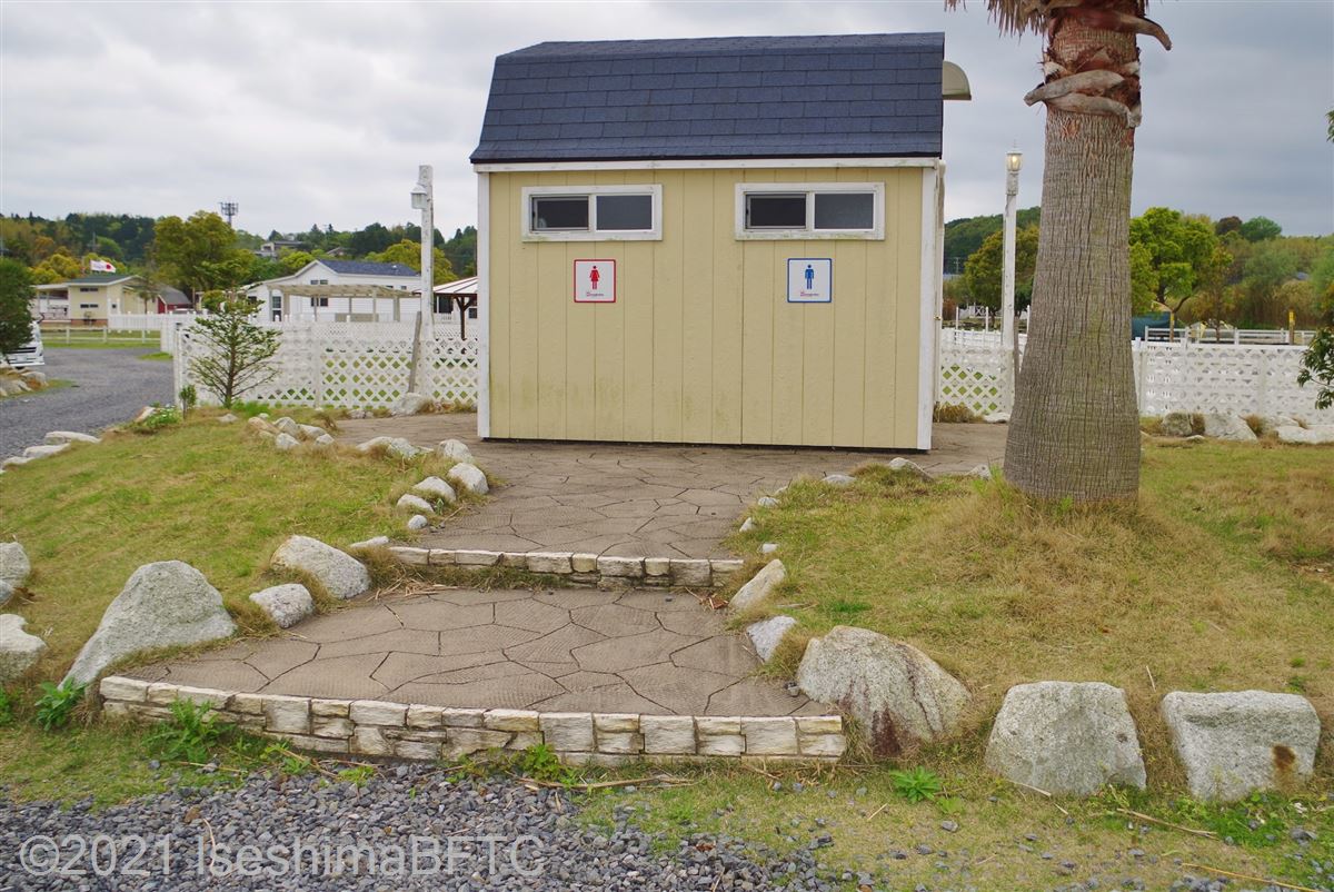 西側、テントサイト前トイレ。ブルーは男性用、ピンクは女性用。